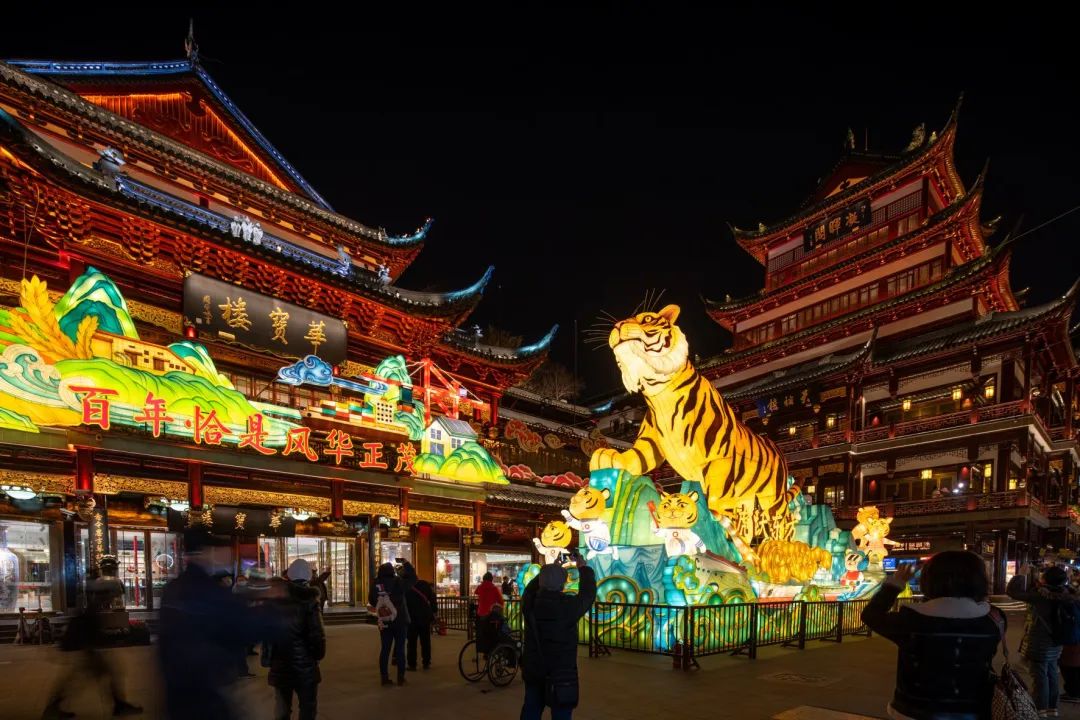从五号门进入豫园商城,凝晖路上千灯点亮,还原了“一夜龙鱼舞”的历史现场。转过凝晖路,中心广场高约9米的“虎跃东方”生肖灯组尤为壮丽。华宝楼墙面,一幅“千里江山图”徐徐展开,写就“百年恰是风华正茂”图卷,呼应巍峨的虎灯。