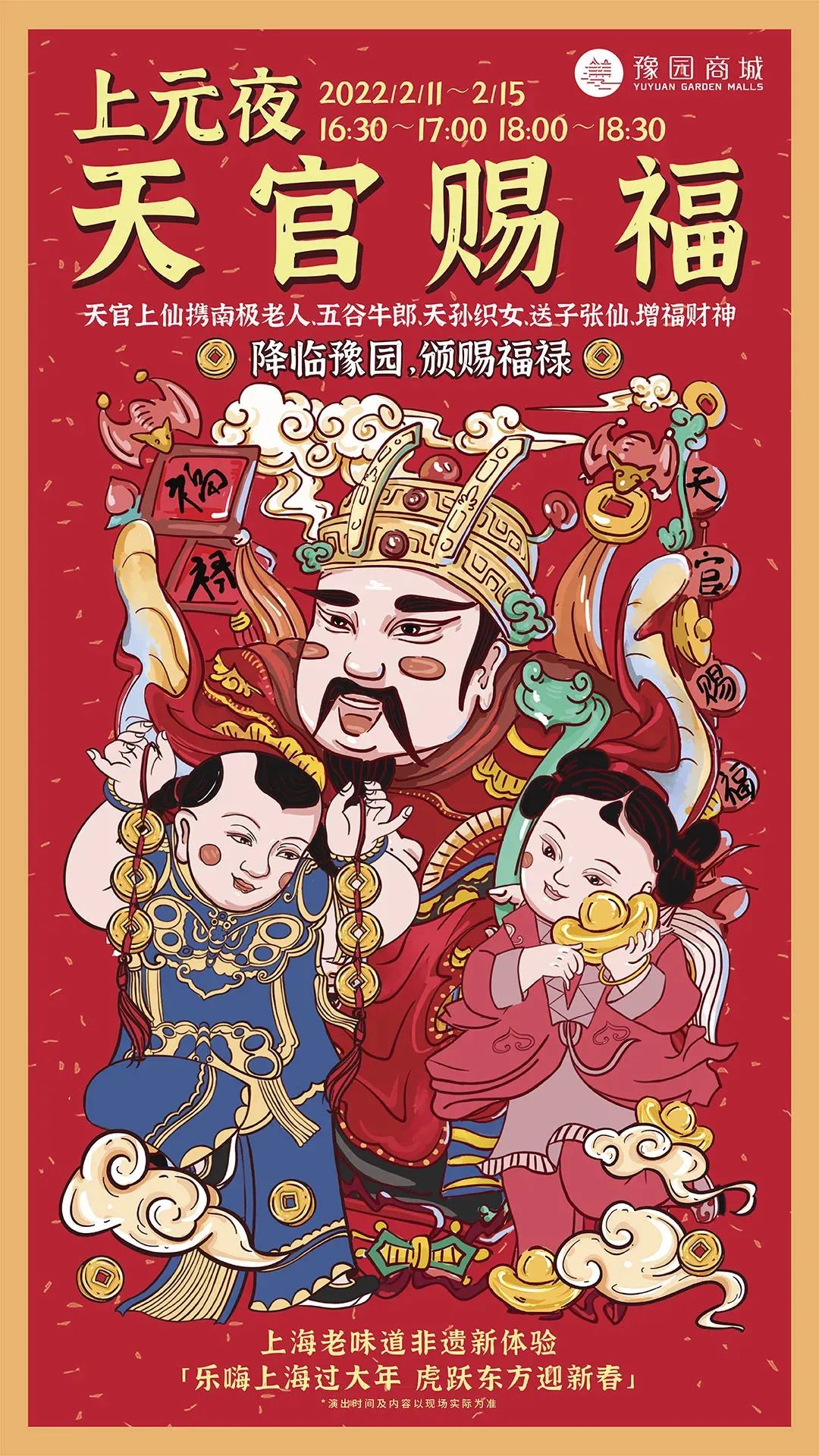 元宵节是天官赐福的正日子,也是中国人新春特有的浪漫狂欢。“天官”携五仙要在豫园为市民游客们送上浓浓中国味的吉祥祝福。
